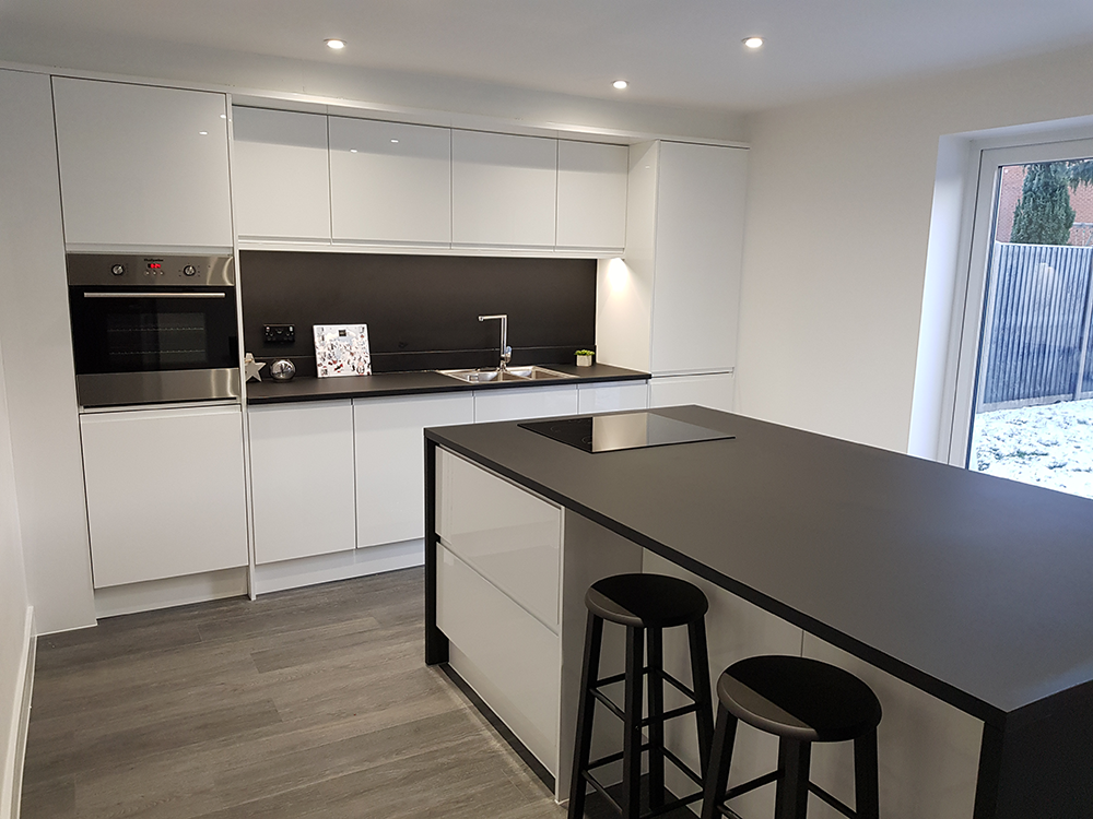 The below is an example of a modest kitchen design that required some design flare and engineering to achieve the customer's vision - a sleek and modern design for his converted kitchen/dining space including an island, without breaking the bank. This was achieved using crisp white J-handle gloss doors, and a contrasting Fenix Nero Ingo worktop. The island was designed as both a cooking space and a dining table. Waterfall Fenix end panels gave a sense of quality usually associated with solid worktops but at a fraction of the cost. Our customer was thrilled with the end result and gave us a 5-star google review.